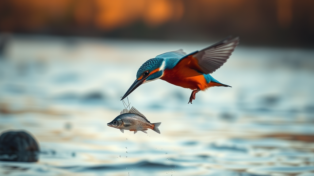 A stunningly realistic photograph captures the vibrant blue and orange hues of a majestic kingfisher as it deftly catches a shimmering silver fish against the backdrop of a softly lit, dawn river. The cinematic lighting enhances the bird’s intricate feather details, shot with an 85mm lens for a sharp focus on the action, creating a dramatic moment showcasing the grace and precision of the kingfisher in its natural habitat.