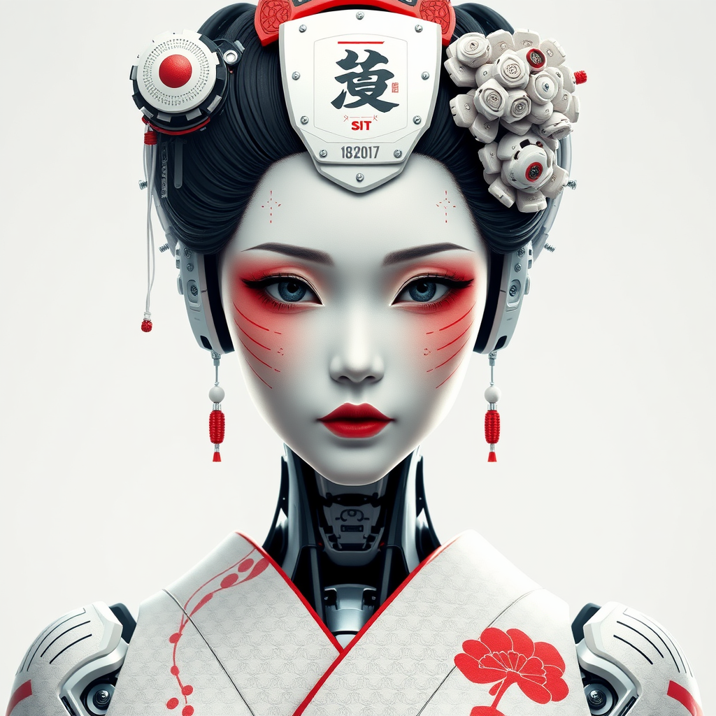 A stunningly realistic portrait of a Japanese robotic geisha, adorned with intricate kanji symbols and futuristic decals. The artwork captures immaculate detail and a sense of technological elegance. Rendered using high-fidelity methods, the image is reminiscent of the visual finesse found in cutting-edge gaming engines. The design draws inspiration from iconic sci-fi motifs like Ex Machina and I, Robot, showcasing seamless integration of traditional and modern elements. The composition evokes the delicate balance between humanity and robotics, while maintaining an artistic harmony without blemishes or distortions. The image is devoid of any glitches or visual errors, encapsulating a perfect synergy of culture and advanced technology.
