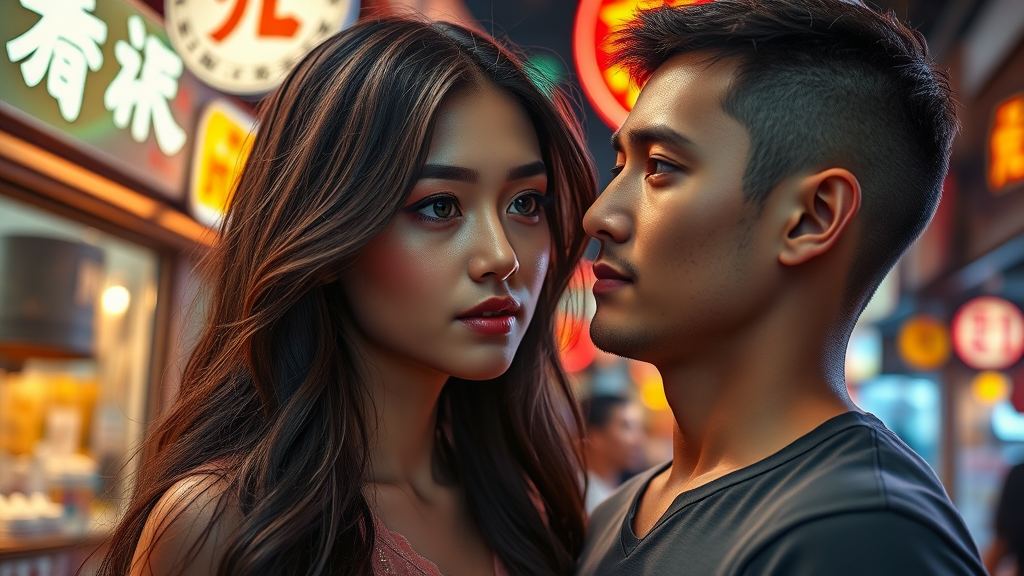 A stunningly realistic portrait of an exceptionally beautiful girl and boy gazing into each other's eyes, embodying the elegance of young supermodels. Set against the vibrant backdrop of an Asian market with glowing neon signs and the bustling energy of night city lights, they exude a romantic aura. The girl captivates with her mesmerizing green eyes, perfectly symmetrical face, and expressive doe eyes, adorned with delicate freckles and high cheekbones. Her long, flowing hair resembles ink cascading down her shoulders, complemented by subtle makeup. The boy stands with a strikingly perfect fitness physique, matching the girl's long legs. Under the cinematic glow of aperture 1.8, bokeh, and lens flare, their melancholy expressions evoke a sense of extradimensional allure. Presented in ultra HD, HDR, and 8K, the photograph captures intricate details and the enchanting atmosphere of the busy market.