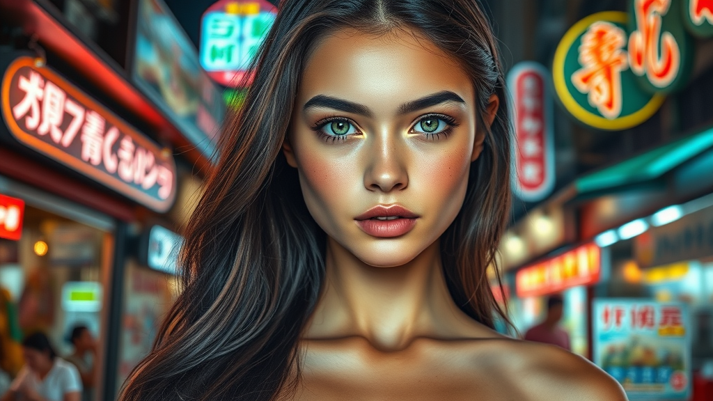 A stunningly realistic portrait of an extraordinarily beautiful young model, set against an Asian market backdrop brimming with vibrant shop neon signs and the glow of city lights at night. This full-body image captures her mesmerizing green eyes and perfect fitness physique. Her long legs complement her symmetrically flawless face, characterized by deep, expressive doe eyes and charming freckles. High cheekbones add to her allure, complemented by long, flowing hair that resembles an inky cascade. Her delicate makeup highlights her features, and the image is taken at an aperture of f/1.8 for a dreamy bokeh effect. With lens flare adding depth, she gazes with a touch of melancholy, her presence almost extradimensional. The shot is in ultra-HD, HDR, and 8K, with cinematic lighting and exceptional detail, against the vivid Asian market with neon signs and nocturnal city ambiance.