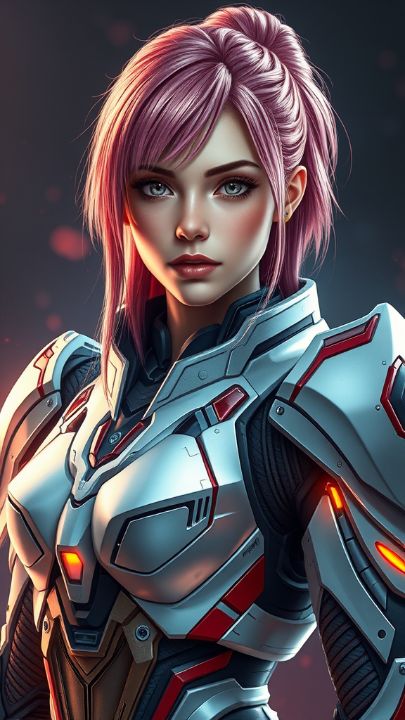 A stunningly realistic portrait of the striking Asuka Langley, adorned in sleek and futuristic sci-fi armor, showcasing intricate detailing and vibrant colors that enhance her dynamic personality. The armor's design merges advanced technology with subtle elegance, capturing her determined gaze and youthful energy, set against a dramatic backdrop that highlights her commanding presence. The composition emphasizes a harmonious blend of strength and beauty, inviting viewers into a vivid, otherworldly atmosphere where every element feels meticulously crafted and lifelike.