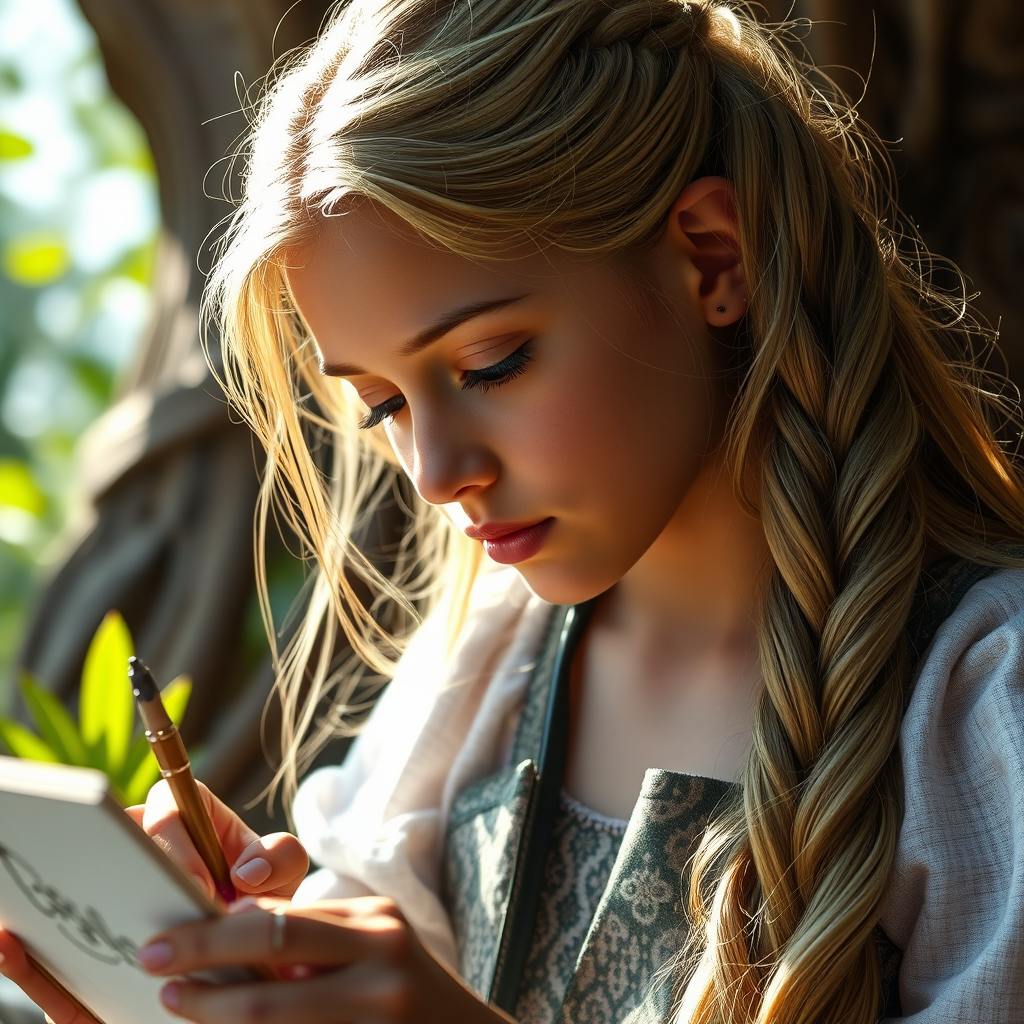 A stunningly realistic portrayal of a girl inspired by Rapunzel from Tangled, featuring a flowing braid, intensely focused as she sketches her tower scene, captured in breathtaking 8k resolution with natural sunlight streaming in, casting gentle shadows and highlights across her serene expression, emphasized by ultra-realistic textures and details, set against a backdrop of lush greenery, evoking a sense of artistic mastery and epic composition.