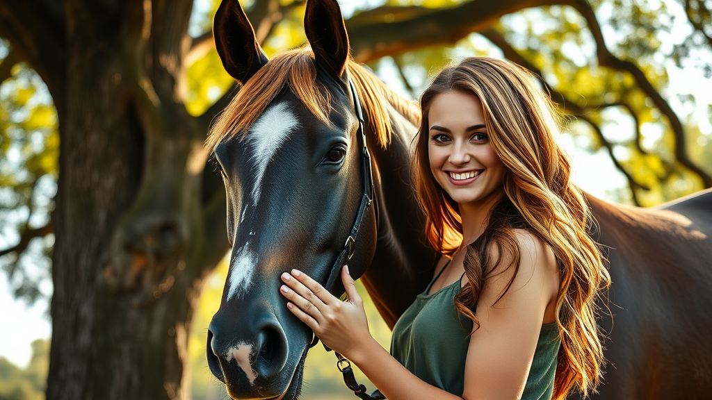 A stunningly realistic young woman, 22 years of age, graced with long, slightly wavy auburn hair, stands gently in front of a majestic horse, softly cradling its muzzle with a serene smile, sunlight filtering through the leaves of a tall oak tree, casting a warm, dappled glow on her and the horse.