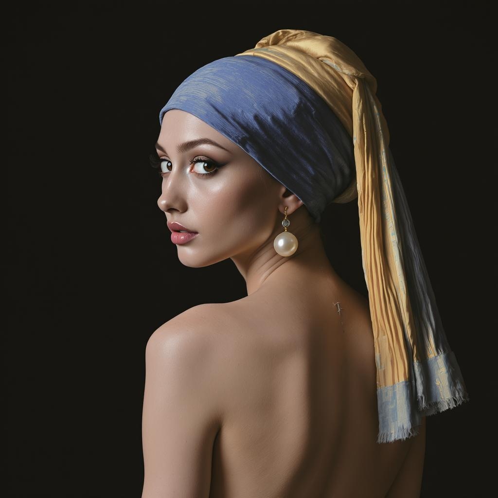 A stunningly slender sei-gwpe with a bare back, adorned with a lustrous pearl earring, wrapped in a flowing blue and gold headscarf, standing shirtless. Captured in cinematic 4k lighting through a 50mm lens, her form is intriguingly and subtly deformed, offering an ethereal and captivating allure.