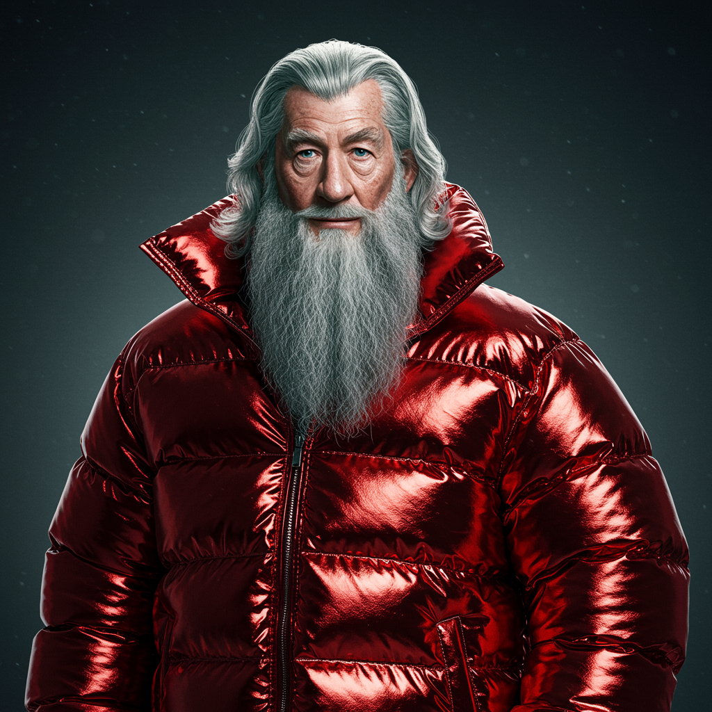 A stylish high-fashion portrait of Gandalf dressed in a futuristic metallic red oversized jacket with a distinct inflatable design, created by the minds behind Yeezy and Balenciaga. The image is expertly lit, with soft, indirect lighting enhancing the intricate details and creating a cinematic glamour. It captures Gandalf in full body, exuding a regal and editorial aura, echoing the sophistication of a Vogue spread. His expression is calm and wise, seamlessly blending the worlds of fantasy and haute couture. The background is elegantly simple, allowing the focus to remain on the intricately designed garment and Gandalf's charismatic presence. The craftsmanship of the jacket is highlighted, its metallic sheen catching the light beautifully. The portrait is detailed, clear, and in sharp focus, showcasing a balance between fantasy elements and high fashion, ensuring that Gandalf’s iconic features are preserved flawlessly, without anatomical or artistic distortions.