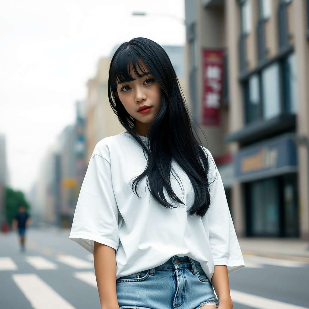 A stylish South Korean girl dressed in an oversized white t-shirt paired with ripped jeans, her long black hair cascading with neatly cut bangs, the scene set on an urban street under an overcast sky. Her subtle makeup accentuates the dramatic lighting that creates an intriguing contrast, capturing the essence of everyday city life in photorealistic detail, reminiscent of an 8k resolution shot with the classic Kodak Portra 800 film aesthetic.