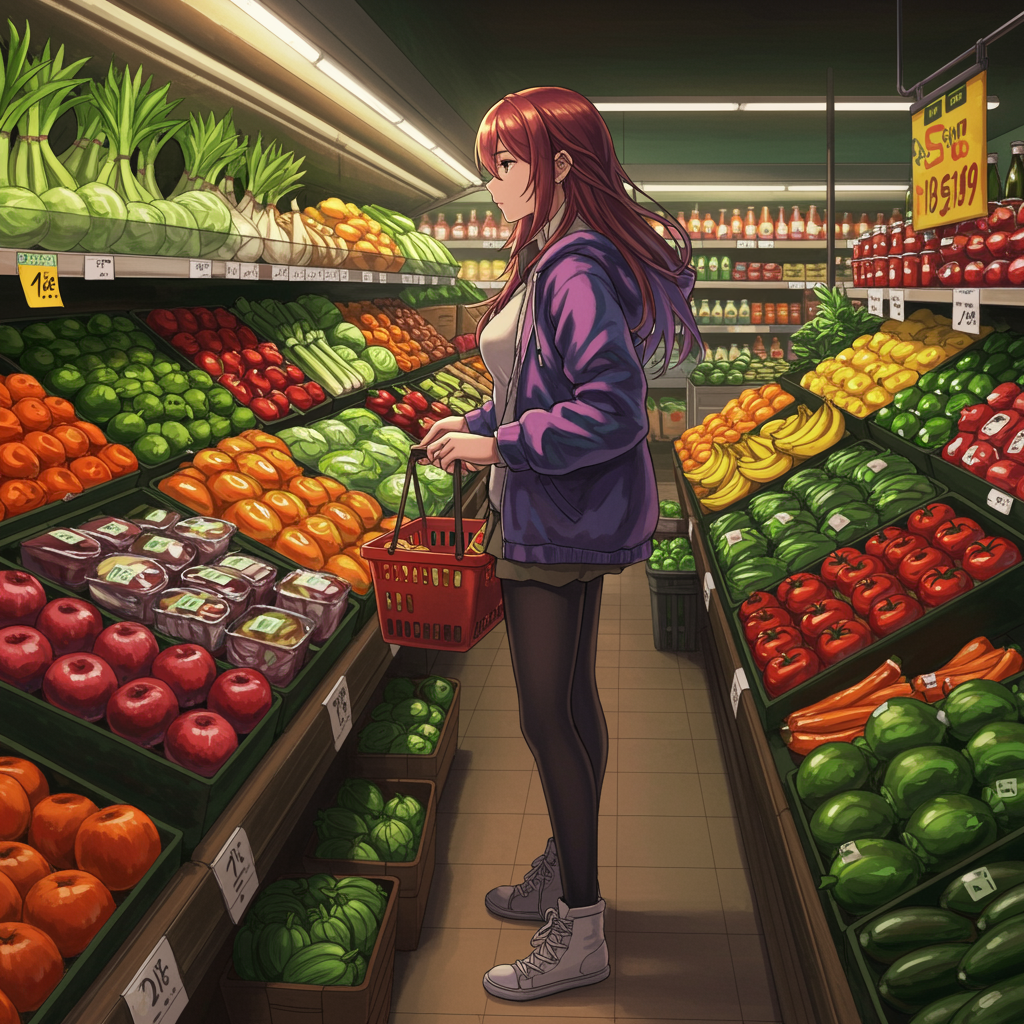 A stylish urban girl browses the vibrant produce section of a bustling supermarket, surrounded by a colorful array of fresh fruits and vegetables. Her expression is focused yet serene as she carefully selects items for her basket. The scene is depicted in a high-quality digital illustration, blending the detailed and atmospheric style of Guweiz with the vibrant and dynamic touch of Bowater. The artwork captures an anime-inspired aesthetic, with rich colors and intricate details that bring the bustling urban setting to life. The girl's modern attire and well-defined features add a contemporary flair, making her the focal point of this captivating digital painting.