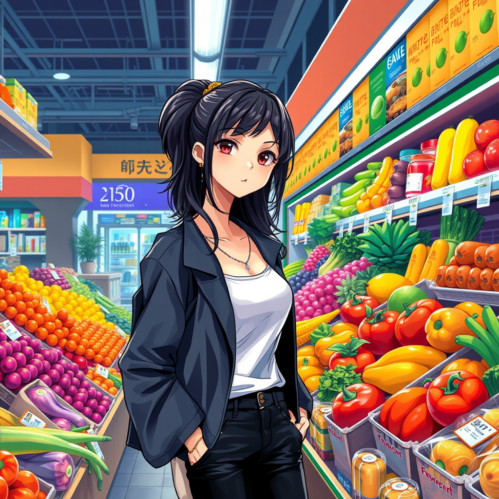 A stylish urban girl is depicted standing in front of a vibrant and colorful produce section of a supermarket, carefully selecting fresh groceries. The scene is rendered in a detailed and high-quality digital illustration, with influences from anime style and the intricate artistry reminiscent of Guweiz and Bowater. The girl has a modern, fashionable appearance, with her attire reflecting a blend of urban chic and contemporary flair. Her expression is focused yet relaxed as she evaluates the produce, surrounded by an array of vivid fruits and vegetables. The artwork captures a lively and bustling atmosphere, with rich colors and dynamic composition, bringing the scene to life with a touch of artistry and personality.