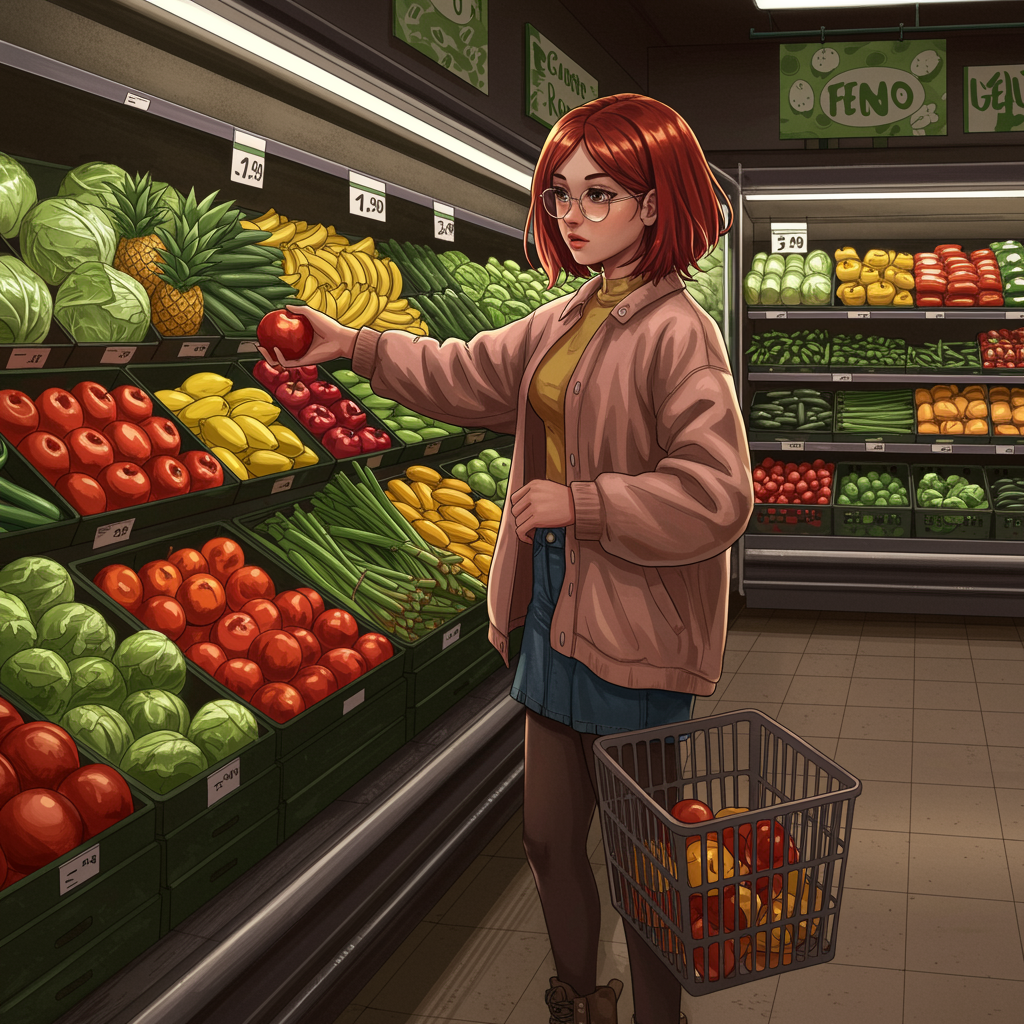 A stylish urban woman stands in front of a vibrant produce section, selecting groceries with a discerning eye. Her expression is focused, yet relaxed, as she navigates the colorful array of fruits and vegetables. Clad in trendy attire that combines modern fashion with a hint of casual elegance, she embodies an anime-inspired aesthetic. Her hair is artfully styled, framing her face as she reaches for a ripe apple. The digital illustration is richly detailed, capturing the lively atmosphere of the supermarket with a touch of whimsy. The artwork features intricate lighting and shading, reminiscent of the techniques used by artists like Guweiz and Bowater, blending high-quality fanart elements with a unique twist. The setting is lively and bustling, yet there’s a serene quality in her poised manner, creating a captivating blend of everyday life and anime artistry.