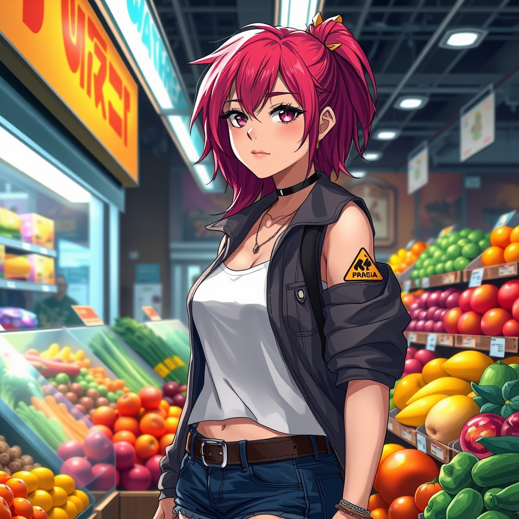 A stylish urban woman with vibrant hair stands confidently in front of a colorful produce section in a bustling supermarket. Her fashionable attire blends edgy streetwear with subtle elegance, while she peruses fresh fruits and vegetables with a discerning eye. The digital artwork captures the essence of anime style, with intricate detailing and a dynamic pose that reflects her determination and independence. Bathed in the warm glow of the supermarket lights, the scene is rich with texture and depth, reminiscent of the art styles of Guweiz and Bowater, bringing the character to life in a vibrant urban setting.