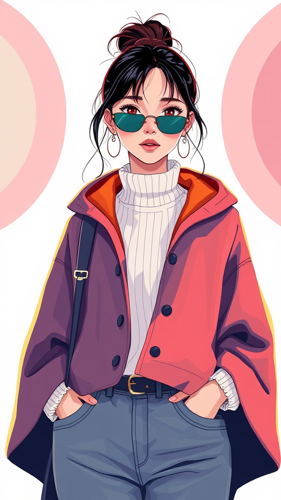A stylish woman dons a contemporary poncho jacket, influenced by the vibrant aesthetics of Duro Olowu, with a nod to the enchanting style of Yanjun Cheng. This digital art piece blends the cozy charm of a lofi girl internet meme, emphasized by its trending recognition on Dezeen. Presented as a catalog photo with the intricate detail of a 3D render akin to Beeple, it exudes the whimsical finesse of Rhads and the softness of Lois van Baarle. The cartoon-style illustration bursts with bright pastel colors, capturing the essence of a retro anime girl rendered in a strikingly beautiful artwork illustration. The composition balances a nostalgic feel with a modern twist, creating an alluring visual experience with an aspect ratio of 2:3.