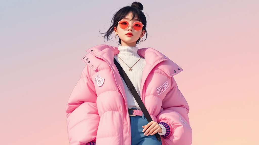 A stylish woman dons an oversized puffer poncho jacket with Off-White inspired accents, exuding a blend of tumblr aesthetics and Yanjun Cheng's style. The digital artwork captures her in a scene reminiscent of the lofi girl internet meme, set to a backdrop of bright pastel colors. This illustration combines elements that could be trending on design sites, akin to a surreal catalog photo. The 3D render is artistically merged with influences from Beeple, Rhads, and Lois van Baarle, offering a cartoonish yet sophisticated depiction. The retro anime vibe completes the piece, presenting a unique vision with a nod to easygoing elegance.