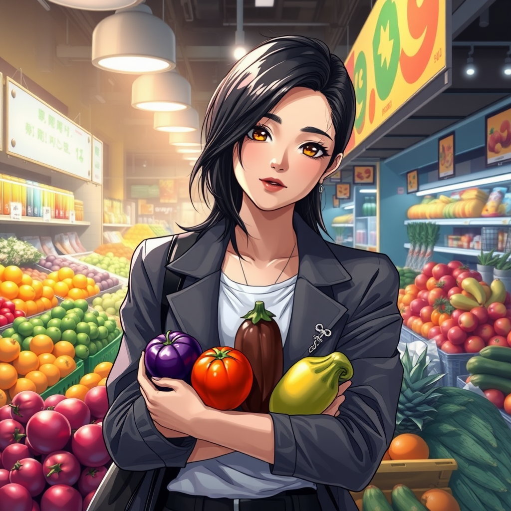 A stylish woman stands confidently in front of a vibrant produce section, her arms gently cradling a variety of fresh fruits and vegetables, the supermarket's lively atmosphere captured in vivid detail. Her expression is focused and contemplative, framed by sleek urban fashion and anime-inspired features. The scene is rendered as a detailed digital illustration, capturing the essence of high-quality fanart with intricate attention to textures and lighting. The artwork draws inspiration from the styles of Guweiz and Bowater, melding soft shadows and dynamic lines to create an engaging urban portrait. The colorful composition highlights the contrast between her modern attire and the natural hues of the produce, encapsulating a moment of everyday life through an anime lens.
