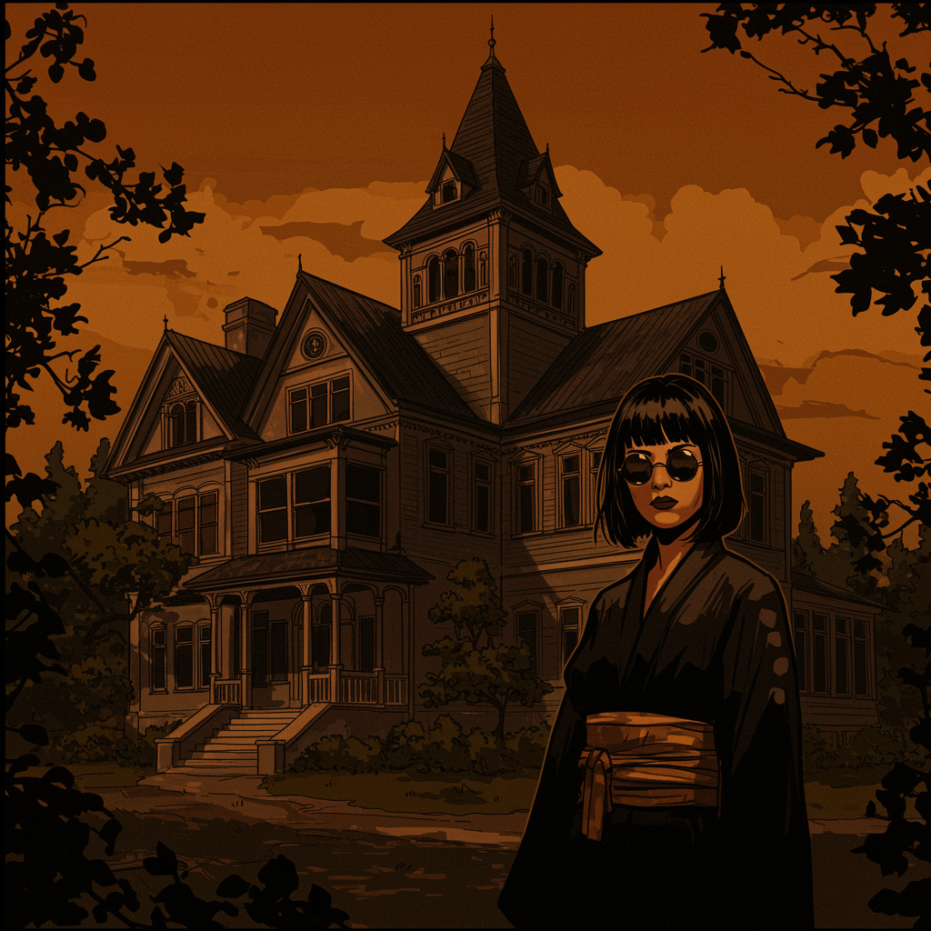 A stylish woman with sleek sunglasses stands confidently beside an old-fashioned manor, her presence a fusion of cyberpunk manga aesthetics and dynamic artistry reminiscent of Ross Tran. The scene is infused with Japanese iconography, as dark black and rich amber envelop the surroundings in bold, graphic illustrations. The woman's attire and pose reflect Japanese tradition, while the atmosphere is painted in multi-layered color fields that create a sense of depth and intrigue. The composition captures a harmonious blend of past and future, tradition and modernity, set against the imposing backdrop of the manor.