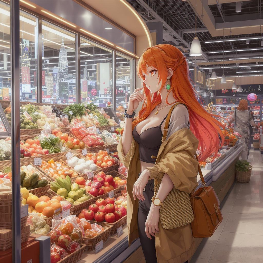 A stylish woman with vibrant, flowing hair stands thoughtfully in front of a colorful produce section, selecting fresh groceries in an elegant supermarket setting. The digital illustration captures her in a moment of urban serenity, surrounded by baskets of lush fruits and vegetables. Her fashionable attire reflects a blend of modernity and casual flair, echoing the energetic vibe of the bustling cityscape beyond. The scene is brought to life in high-quality fanart style, with rich detail and vivid colors reminiscent of Guweiz's atmospheric artworks and Bowater's dynamic character design, capturing the essence of anime-inspired digital painting.