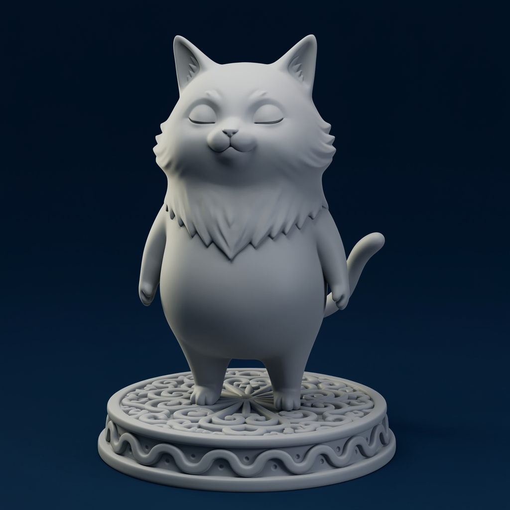 A stylized 3D-rendered sculpture of a plump, cartoonish cat standing upright on an intricately patterned circular base. The model boasts a smooth, clay-like texture with a visible quad polygon topology, providing a subtle wireframe overlay look. The cat features a calm, meditative expression with closed eyes, slightly larger ears than typical, and a robust, bushy tail that curls slightly at the tip. Rendered in a soft matte gray material against a deep midnight blue background, this design is ideal for digital modeling or character design showcasing, offering a playful yet sophisticated aesthetic.