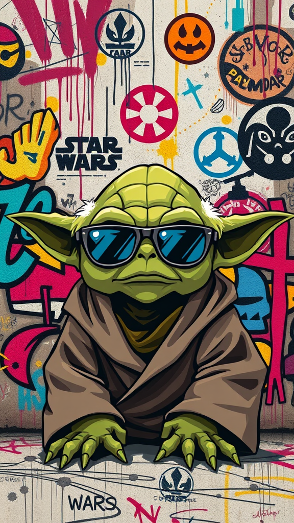 A stylized depiction of Yoda wearing sunglasses, set against a vibrant urban graffiti backdrop filled with colorful street art symbols and abstract shapes, blending Star Wars iconography with edgy street culture vibes.
