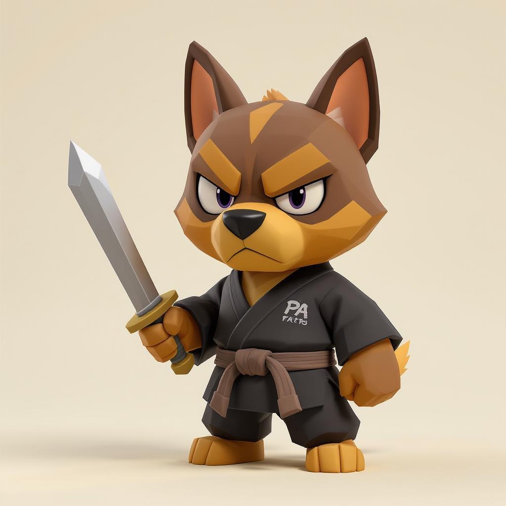 A stylized, low-poly 3D character of Paco the Dog featuring a toy-like aesthetic, wielding a short sword with an intense facial expression. Paco is dressed in a sleek black gi with a brown belt, set against a neutral cream background. The design includes clean lighting and soft shadows, enhancing his vivid, polygonal features. Small creative modifications include a subtle texture on the gi to imply a woven fabric and slightly oversized, expressive eyes to emphasize his determined demeanor. This game-ready asset maintains the core concept while adding a touch of whimsy.