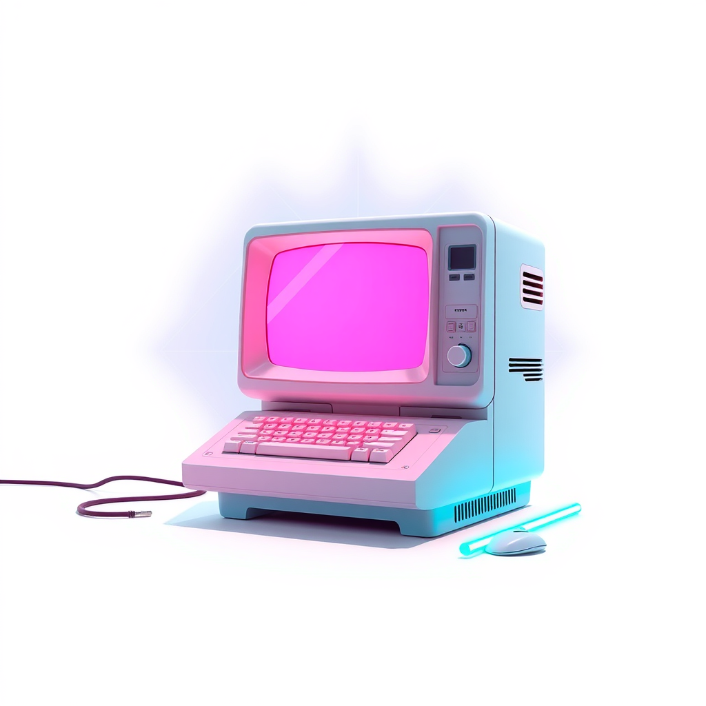A stylized vintage depiction of a retro computer featuring a vaporwave aesthetic, infused with the dynamic and bold style of Jim Steranko, utilizing a color palette of light pink and light blue, set against a minimalist white background, with subtle creative elements such as geometric patterns and neon glow highlights that complement the core concept.
