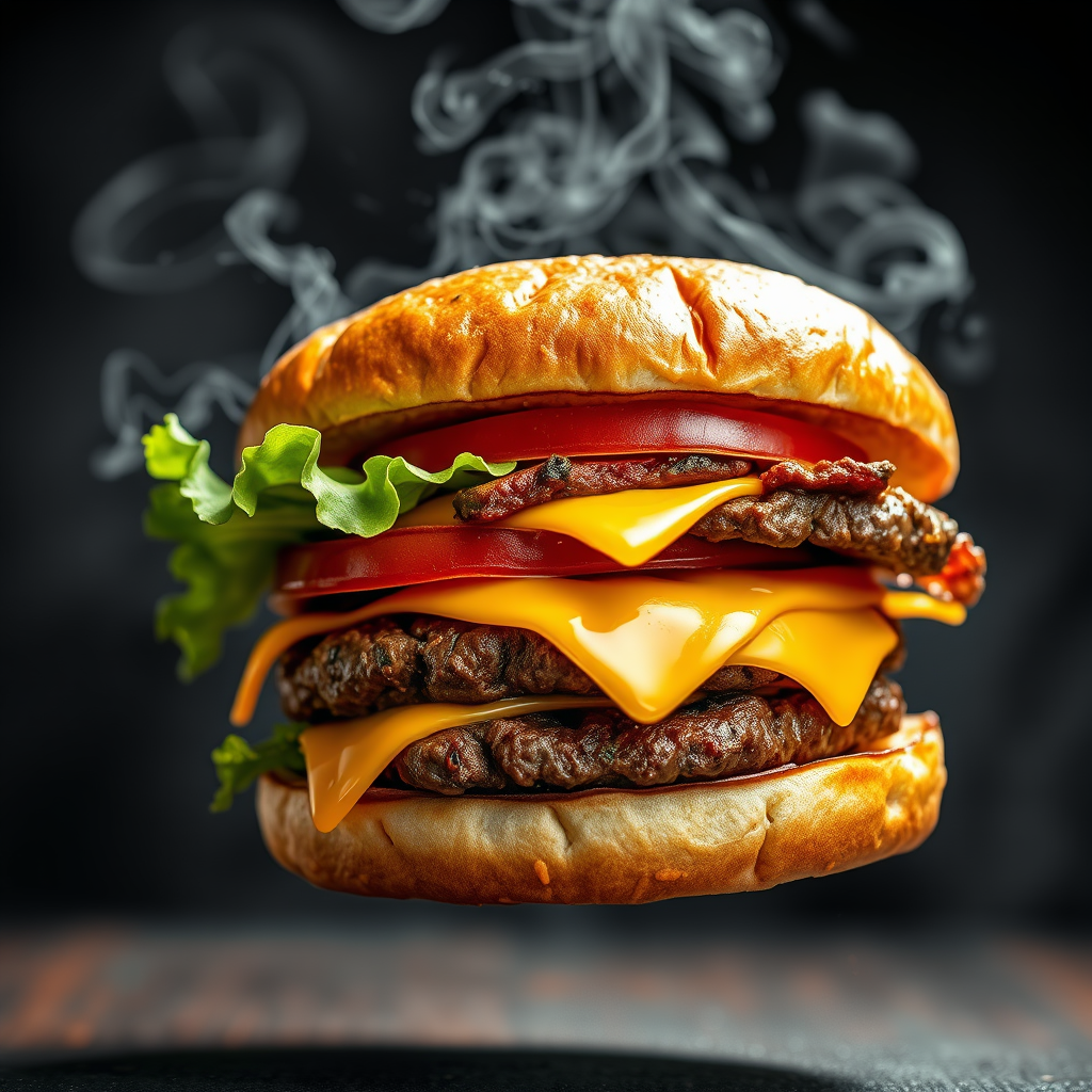 A succulent burger deconstructing in mid-air, layers of juicy beef, melted cheese, fresh lettuce, and ripe tomato captured in a moment of savory delight, steaming with warmth, crafted for a mouthwatering promotional image, featuring intricate textures and HDR finesse, embodying a cinematic allure with the touch of an Adobe Lightroom artistry, showcasing every detail in high definition.