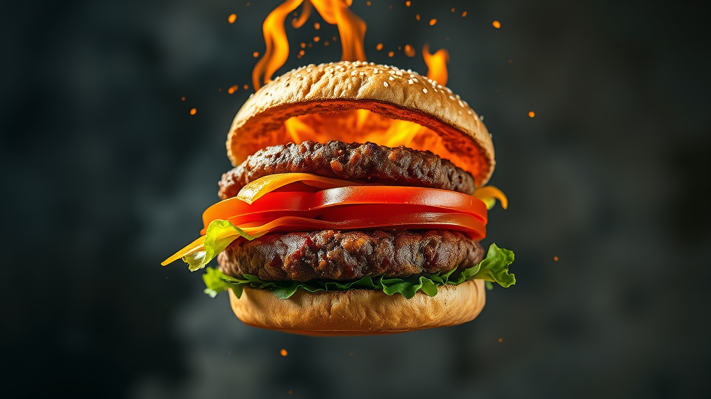 A succulent burger deconstructing mid-air, each component bursting with flavor and heat, captured in a tantalizing promotional shot. The intricately detailed layers, from the juicy, perfectly seared patty to crisp lettuce and ripe tomato, are highlighted in a cinematic, HDR style using Lightroom, showcasing the mouthwatering textures and vibrant colors.