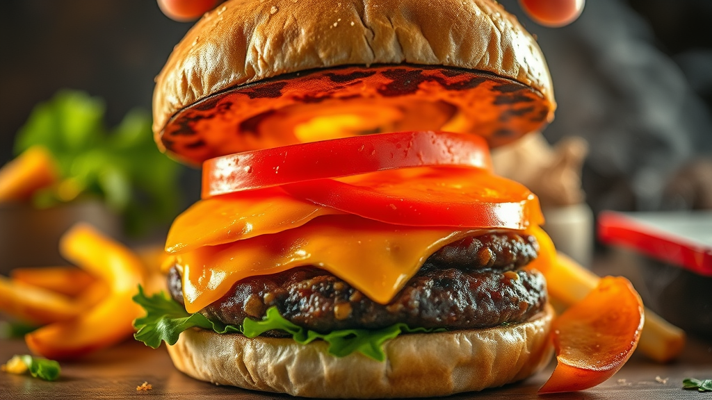 A succulent burger disassembling in slow motion, each component vibrant and flavorful, steaming with heat, captured in a captivating promotional photo. The intricate details and textures are vividly enhanced in HDR, immersing viewers in a cinematic experience with each frame meticulously fine-tuned in Adobe Lightroom, showcasing an enticing, mouth-watering masterpiece.