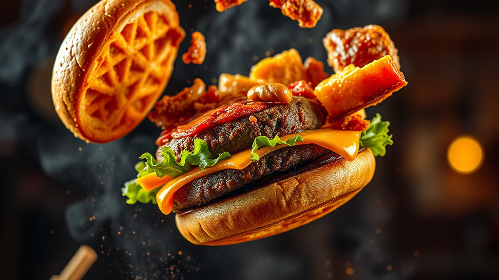A sumptuous burger disassembling mid-air, its components vividly tumbling—succulent, flavorful, steaming, captured in a dynamic promotional shot with exquisite details and an HDR, cinematic touch, meticulously refined in Adobe Lightroom, highlighting every intricate texture and appetizing layer.