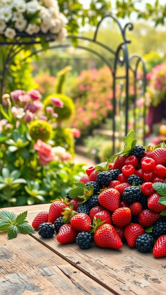 A sumptuous Victorian arrangement of lush berries featuring juicy strawberries, plump blackberries, and tart cranberries, exquisitely detailed and life-like, rests elegantly on a rustic wooden garden table. In the backdrop, a charming Victorian garden unfolds, teeming with blossoming flowers and intricate wrought-iron accents, bathed in the soft, dappled light of a sunny afternoon. The scene radiates with vibrant colors, capturing the essence of a serene moment in a bygone era.