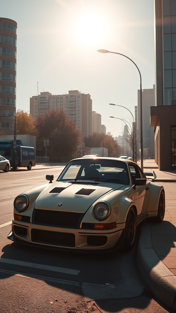 A sun-baked RUF CTR parked on a deserted urban corner, a fusion of midday sunlight and high-tech edgework, captured in an 8K cinematic ultrawide 16:9 aspect ratio, filtered to an upbeta 10, with a voodoo rayshader with fog and sun scattering set to high.