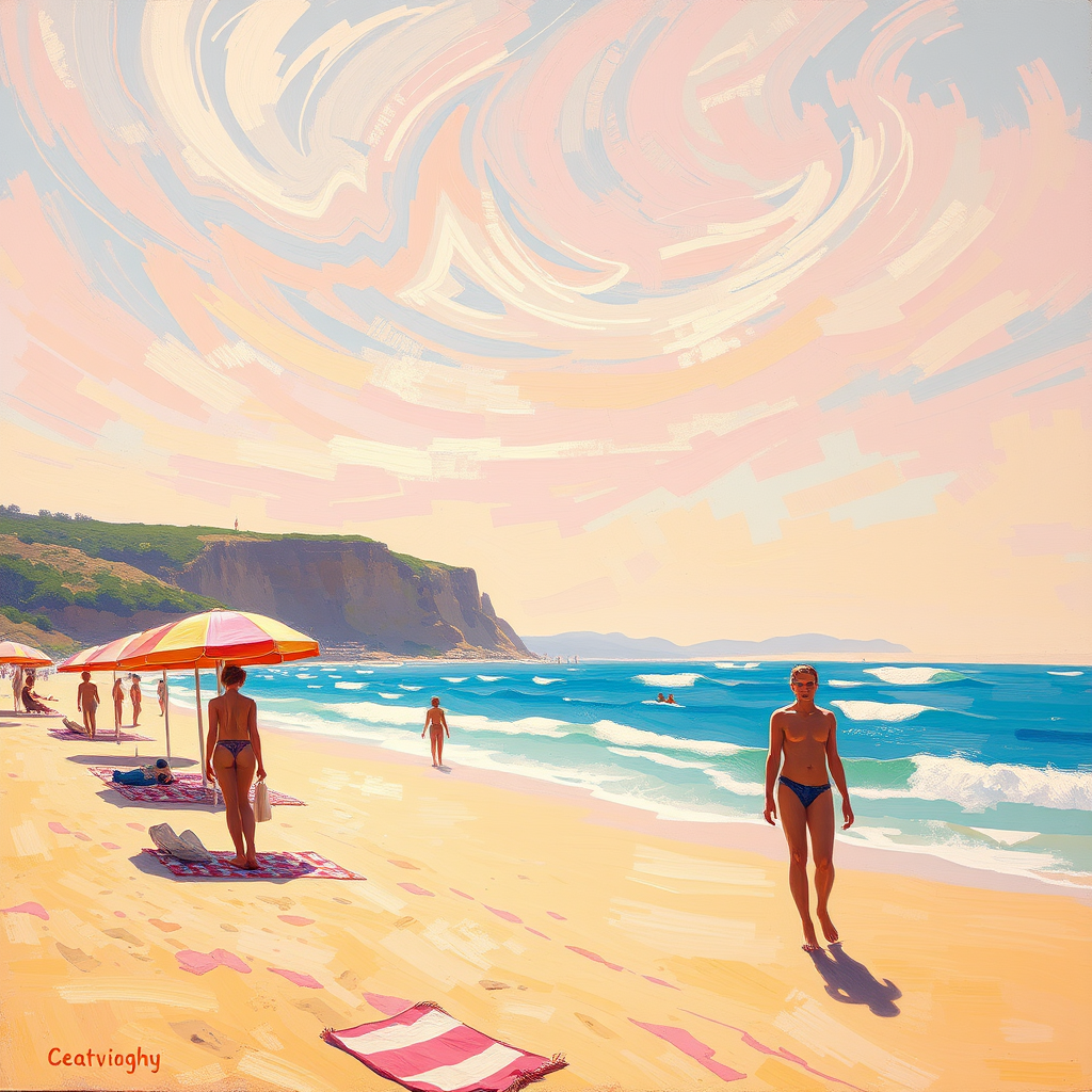 A sun-drenched beach scene captures the essence of Impressionism with its play of light and color, inspired by the works of Claude Monet and Pierre-Auguste Renoir. The scene features an array of bright, pastel hues that wash over the sandy shoreline and the gentle waves of the sea. The figures on the beach are painted with loose, expressive brushstrokes, their forms transformed into distorted and dreamlike figures that border on the surreal, influenced by the unsettling creativity of Andrew Atroshenko. The beach umbrellas and towels are rendered in soft, faded tones, while the sky swirls above in a blend of peach, lavender, and soft blues. In the background, distant cliffs and trees melt into an abstract suggestion of nature, their colors reflecting the warmth of the sun. The overall effect is both enchanting and slightly eerie, evoking a sense of beauty in the unconventional and unexpected shapes.