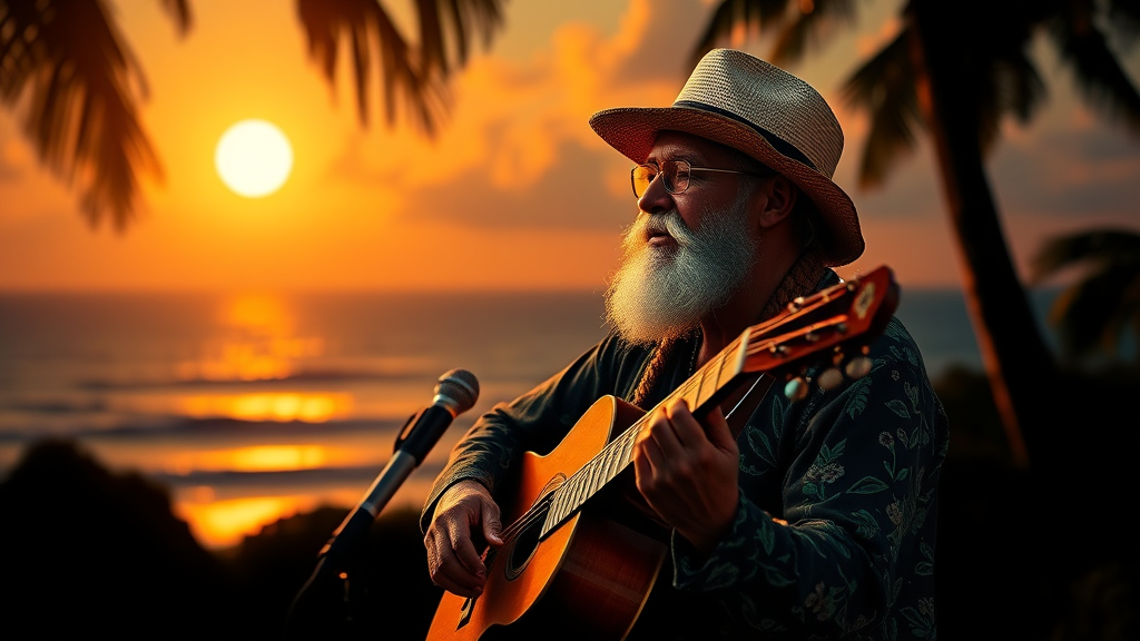 A sun-kissed island legend, weaving stories of unity and love through soulful rhythms and heartfelt lyrics, offering solace and inspiration to a diverse world with each strum of his guitar, spreading messages of peace that resonate across generations.