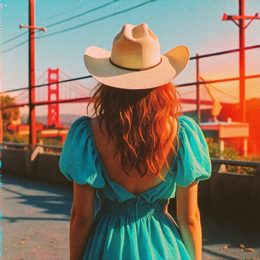 A sunlit 35mm photograph captures a woman in a flowing azure dress paired with a wide-brimmed cowboy hat, her exposed back facing the camera. She stands confidently under the Texan sky, her silhouette drenched in the vibrant summer hues of cyan and orange. The artistic style hints at influences from Nathalie Rattner, with a nostalgic Tumblr flair, and carries the emotive, dreamy essence found in Rex Orange County's music. Her serene expression and pose evoke the grace of an Ana de Armas portrait, while the brushstroke-like textures echo the work of Maxwell Boas and Jenny Saville. Despite a grainy, low-resolution finish akin to the analog photos by Lily Frank, the image vividly portrays the summer of 2020. As the warm sunset bathes her in soft azure and red tones, the wide-open f/2 aperture plays with light, encapsulating a moment that feels timeless yet artistically spontaneous, possibly set against the bustling backdrop of San Francisco.