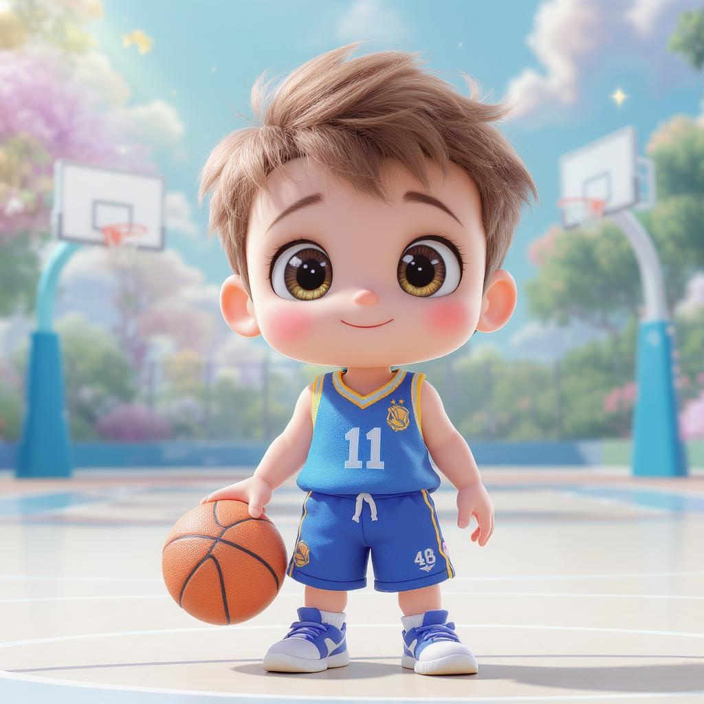 A super adorable sports boy wearing a basketball jersey and blue shorts stands on a pristine, bright basketball court. He has large, expressive eyes filled with excitement and wonder. The setting is dreamy and colorful, emanating a sense of joy. The boy resembles a Pop Mart LP toy with high detail, hyper quality, and bright, vivid colors. The style is akin to Disney, with a touch of whimsical charm and fine luster. Rendered in 3D, the frontlighting highlights his cute features, showcasing ultra-detailed textures and a glossy finish, capturing an 8k, crystal-clear face shot.