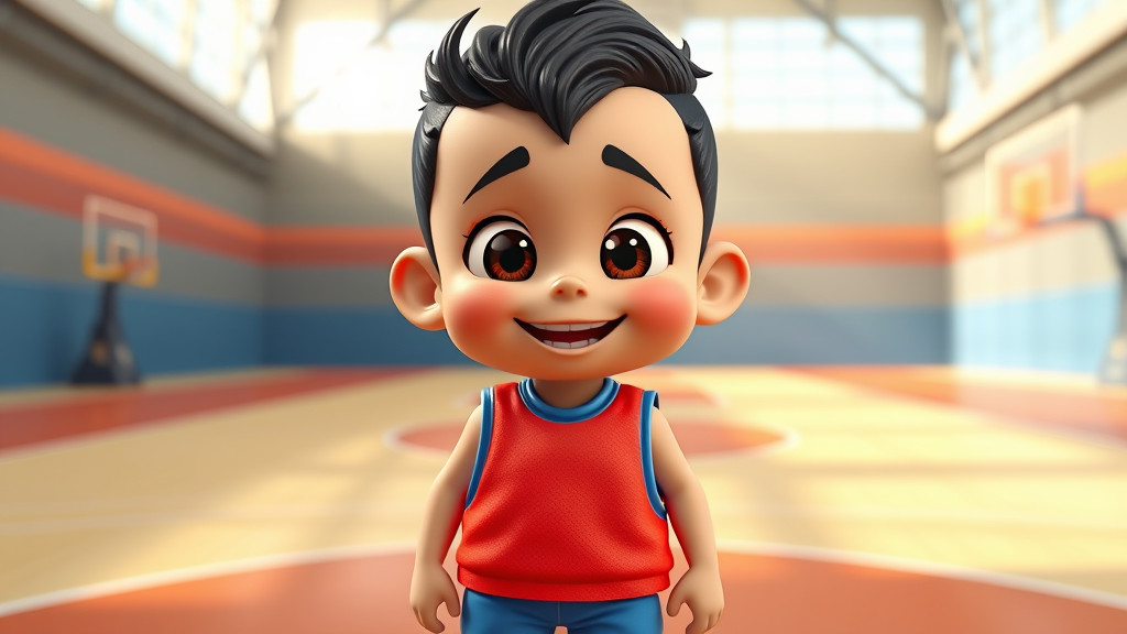 A super adorable sports boy with a cheerful expression, dressed in a vibrant basketball vest and blue shorts, featuring big, expressive eyes filled with wonder. He stands on a pristine, well-lit basketball court, exuding an air of excitement and charm. Inspired by pop art toy styles, the character is rendered with high detail and hyper quality, boasting radiant colors and a dreamy, Disney-like charm. The boy's likeness is captured in a mockup blind box toy style, showcasing a fine luster and ultra-detailed 3D render. The image is presented in 8k resolution with bright front lighting, focusing on a close-up of his face to highlight his enchanting, ultra-detailed features.