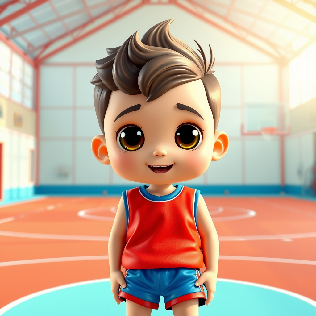 A super adorable sports boy with a youthful charm, wearing a vibrant basketball vest and stylish blue shorts, his big watery eyes filled with excitement and wonder. He's set against the backdrop of a pristine, bright basketball court. The scene is dreamy, capturing the essence of a super cute boy by Pop Mart, rendered in high detail and hyper quality. The colors are bright and vivid, reminiscent of Disney's whimsical style, with a fine luster that enhances the 3D render, creating an OC render with impressive quality. The entire composition, boasting 8k resolution, features front lighting that highlights the boy's face, ensuring ultra-detailed features that exude charm and playfulness, much like a collectible in a mockup blind box.