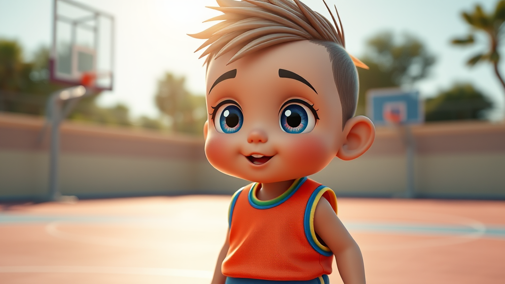 A super adorable sports boy with an enchanting aura, dressed in a vibrant basketball vest and bright blue shorts, his big, expressive eyes resemble shimmering pools of wonder. The clean, sunlit basketball court forms a perfect backdrop, enhancing the dreamy and enthusiastic vibe of the scene. Inspired by the pop mart style, this figure boasts fine detail and hyper-quality rendering, reminiscent of a Disney character brought to life. With a radiant color palette and glossy finish, the 3D render showcases a lively, frontlit face shot, capturing ultra-fine details and ensuring the character emanates an irresistible charm.