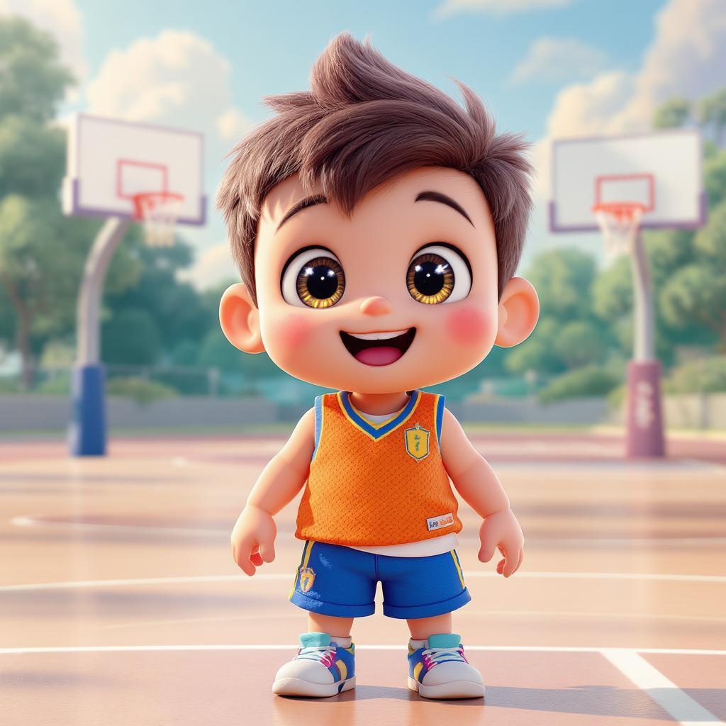 A super cute and energetic sports boy with sparkling big eyes, wearing a vibrant basketball vest and blue shorts, standing excitedly on a pristine, well-lit basketball court. The dreamy atmosphere is enhanced by the high-detail, hyper-quality rendering, with bright colors reminiscent of a classic Disney style. The figure boasts fine luster and ultra-detailed features, embodying a mockup blind box toy aesthetic. The boy's face shot captures his youthful exuberance, brought to life in a meticulous 3D render with an 8k resolution, ensuring the brightest front lighting and the finest quality visual representation.
