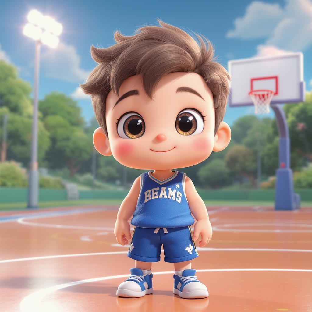A super cute sports boy with big, expressive watery eyes, dressed in a stylish basketball vest and matching blue shorts. He stands on a pristine, brightly lit basketball court, exuding a dreamy, excited charm reminiscent of a Pop Mart toy. The scene captures a high-detail, hyper-quality aesthetic with bright, vibrant colors and a Disney-inspired style, showcasing a fine luster and intricate 3D render. This adorable character embodies the essence of a collectible toy in an 8k resolution with ultra detailing and front lighting emphasizing his joyful expression and youthful energy.