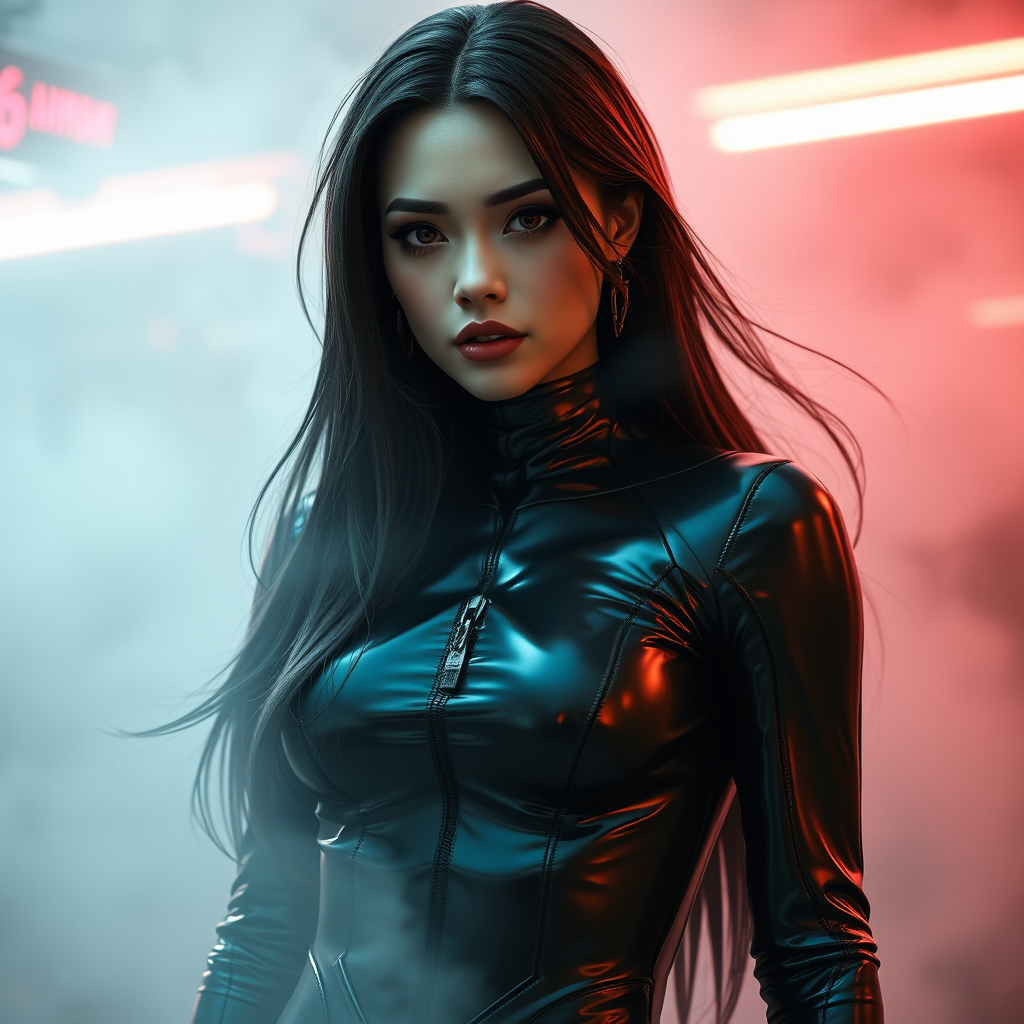 A superhero in a sleek black latex outfit, exuding a captivating aura with a beautiful, realistic face and skin, adorned with long, flowing, gorgeous hair. The character's striking physique is wrapped in an exquisitely detailed, full-body suit reminiscent of cyberpunk 2077, Ghost in the Shell, Deus Ex, and Blade Runner aesthetics. With a backdrop inspired by the Matrix, enveloped in mysterious smoke, the scene is captured in ultra-high definition, emphasizing intricate, hyper-detailed textures. Photography shot with a 50mm f/1.6 lens, showcasing finely detailed outfit textures, rendered using Octane and Unreal Engine technologies in collaboration with Weta Digital and Wêtà FX. Artistic influences from WLOP enhance a cinematic feel, characterized by advanced color grading and editorial flair. Illuminated by an interplay of neon and ambient light sources, the atmosphere oscillates between light and darkness, delivering high contrast yet balanced visual harmony. Shot in Super-Resolution ProPhoto RGB, capturing 32k megapixel clarity, the lighting involves a dynamic mix of spotlight, front, and backlighting techniques. Employing a range of advanced photographic and CGI techniques, the scene is constructed with volumetric, ambient, and rim lighting effects, creating glowing highlights and shadows. Meticulous post-processing integrates ray-traced reflections, shaders, and ambient occlusion, lending a shimmering edge through ray tracing, diffraction grading, and chromatic aberration. The finished piece blends CGI, VFX, and SFX into a visually stunning, intricately detailed story.