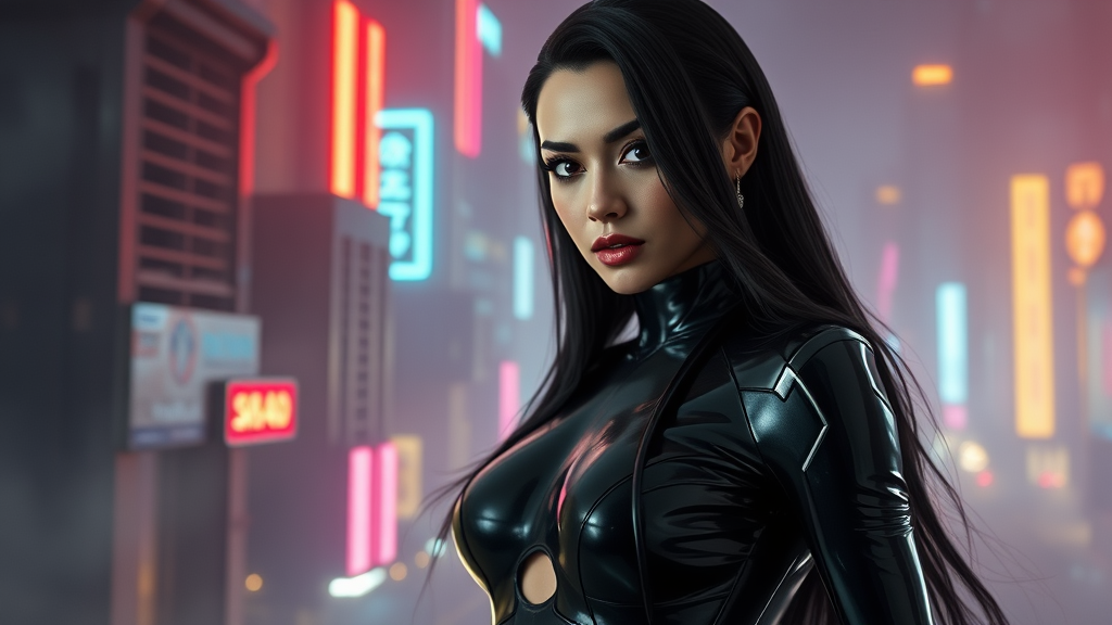 A superhero in a sleek black latex suit, with a stunningly beautiful face framed by cascading long hair, set against a backdrop of a futuristic cityscape. Her presence exudes power and allure, reminiscent of cyberpunk classics like Ghost in the Shell and Blade Runner. The scene is richly detailed, capturing the essence of a world bathed in neon lights and shadowy hues. The imagery is highly detailed, crafted with the depth of an octane render and the realism of Unreal Engine. The visual aesthetics draw inspiration from cinematic icons, featuring a dramatic play of light and shadow, with volumetric lighting and intricate reflections enhancing every detail. The atmosphere is thick with virtual smoke, creating a moody, immersive environment. It’s a blend of modern photography techniques, like high dynamic range and ProPhoto RGB, with sophisticated VFX elements, showcasing exquisite levels of detail and artistry.
