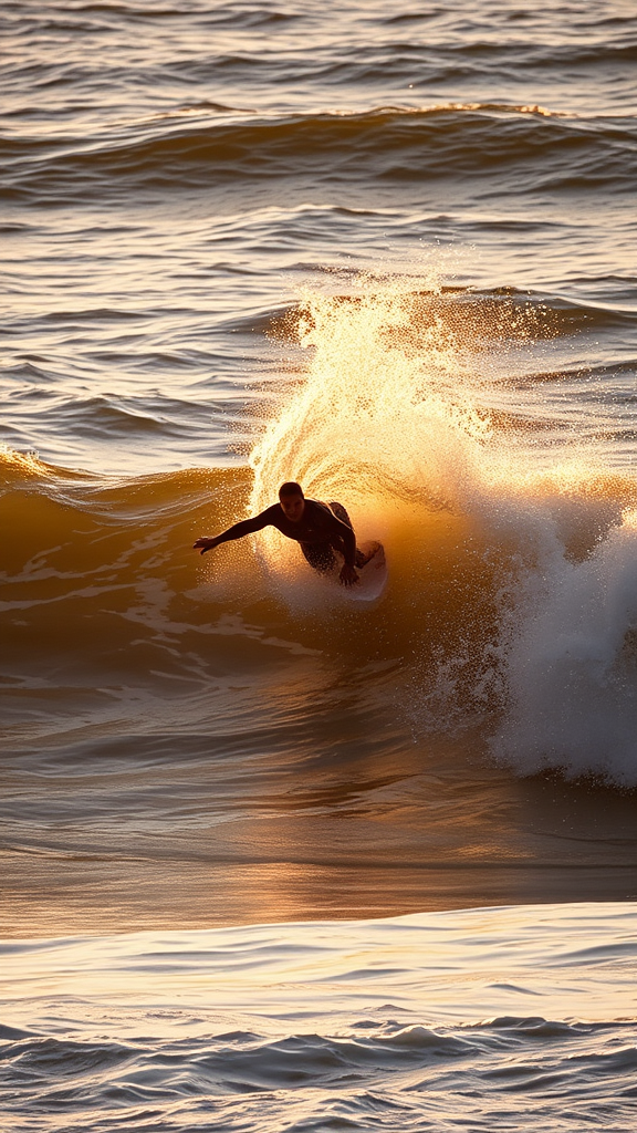 A surfer rides the waves with grace, cutting through the ocean's surface as the sun casts a golden glow, illuminating the water's spray in a dance of light and motion.