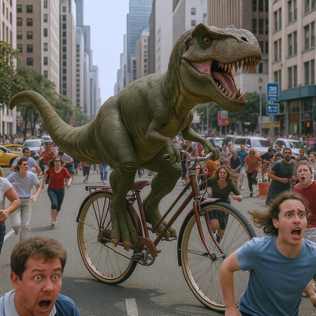 A surprisingly lifelike Tyrannosaurus rex comically pedaling a vintage bicycle, its massive tail swinging behind, while a crowd of onlookers darts in all directions, faces painted in exaggerated expressions of terror and disbelief, against a backdrop of a bustling cityscape.