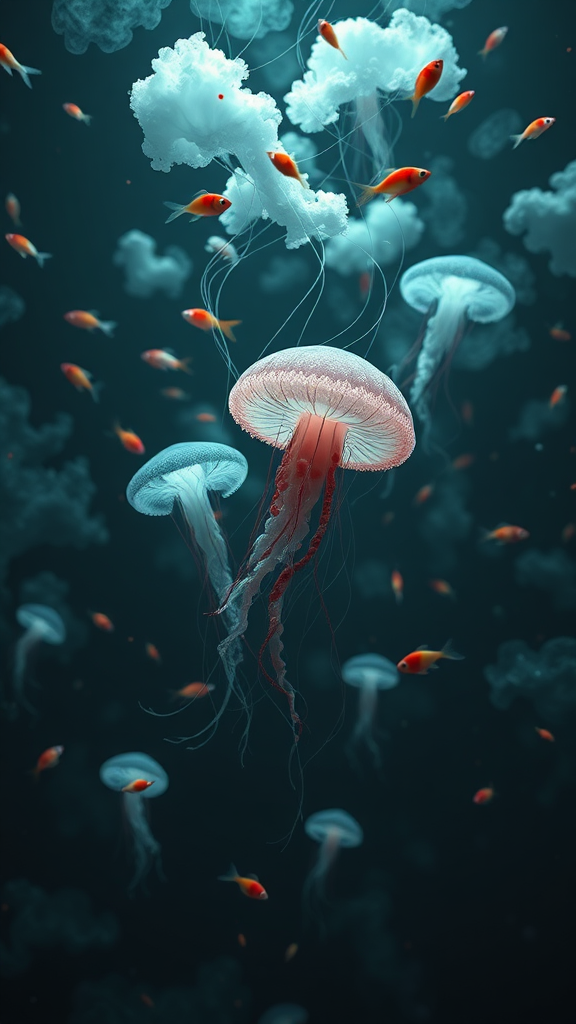 A surreal 3D artwork depicting ethereal jellyfish drifting amidst vibrant, kaleidoscopic fish, enveloped in wispy clouds, all rendered in a dark yet chaotic style with subtle shades of light black and aquamarine. The scene captures an animated, fluid aesthetic reminiscent of gossamer fabrics gently floating, reminiscent of gestural, flowing movements seen in dynamic gifs. This site-specific piece evokes a whimsical, dreamlike quality, reminiscent of an abstract art collection from Flickr, set against an elongated canvas of 35:52, inviting viewers to lose themselves in its immersive depths.