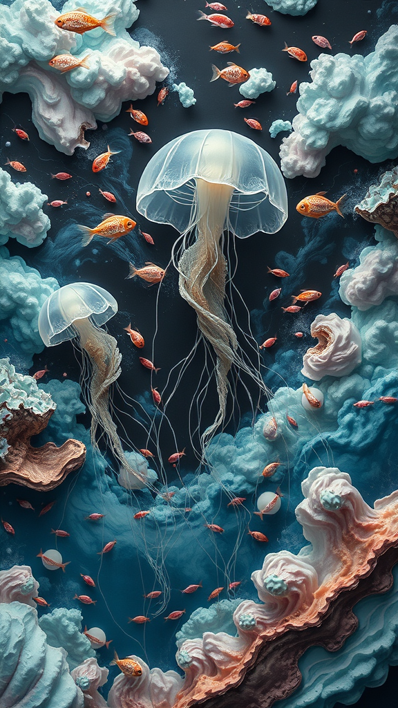 a surreal 3d painting of ethereal jellyfish drifting amidst vibrant schools of fish and swirling clouds, capturing a dark and chaotic atmosphere in hues of light black and aquamarine, with elements reminiscent of animated gifs and site-specific installations. delicate gossamer fabrics flow fluidly with each brushstroke, evoking a sense of movement akin to flickr's dynamic visuals, with a focus on fluid and gestural expressions --ar 35:52