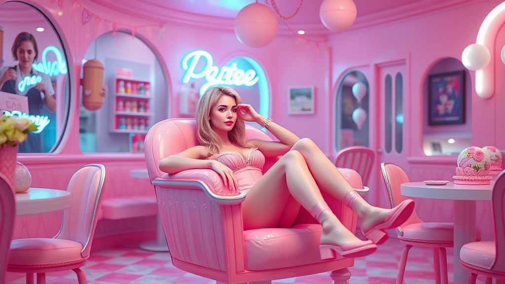 A surreal 3D render of a blonde woman lounging on a bubblegum pink chair in a whimsical pink ice cream parlor, featuring elements inspired by Sydney Sweeney and capturing the essence of Kim Petras with a dash of Sophie cover album flair. Infused with the surreal style artistry akin to Mike Winkelmann and Galen Dara, the scene evokes a retro pink synthwave aesthetic. This vibrant scene is styled as album art, blending bubblegum pop with whimsical and dreamlike vibes, all encapsulated in an 8k resolution promo art setting. The woman is enveloped in a bubblegum body, merging seamlessly with the ethereal, nostalgic atmosphere.