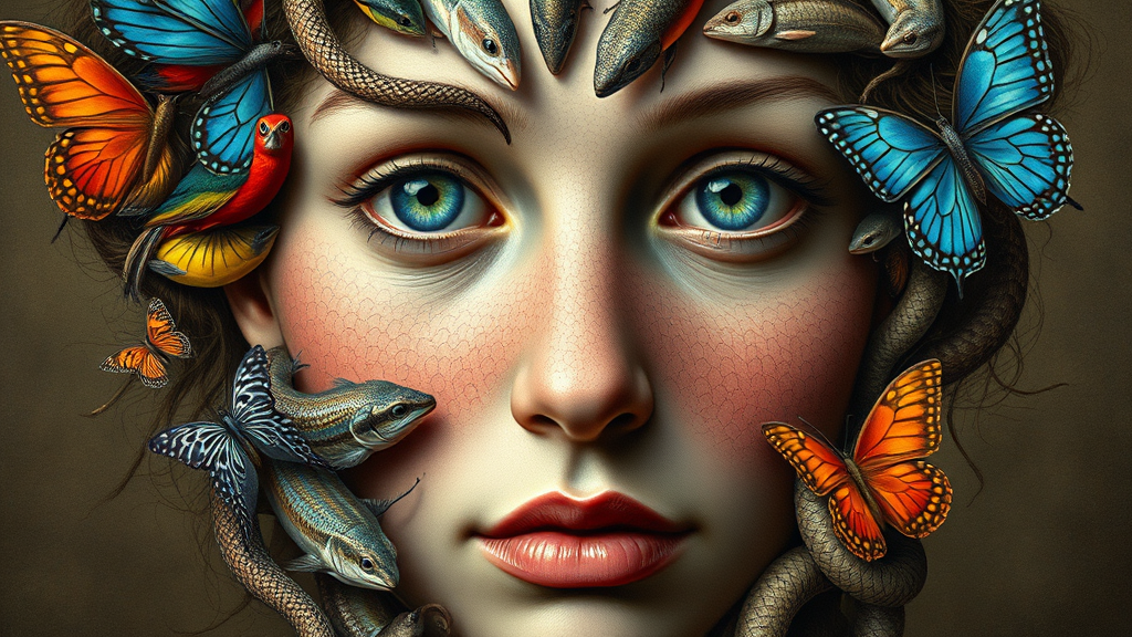 A surreal and highly detailed portrait of a person whose face is intricately formed by an array of animals, each species thoughtfully placed to emulate the contours and textures of facial features, skin tones, and hair. Birds with vibrant feathers create vivid eye shapes, while scales of reptiles form subtle shading across cheeks. Tiny mammals interlock to shape a delicate nose, and fish with shimmering scales mimic the play of light on skin. The hair flows with the interwoven bodies of serpents, and butterflies dusted in blues and yellows trace the gentle arc of eyebrows. The entire image is a harmonious blend of nature's diversity, evoking a sense of wonder and curiosity, akin to the enchanting portraits of Giuseppe Arcimboldo.