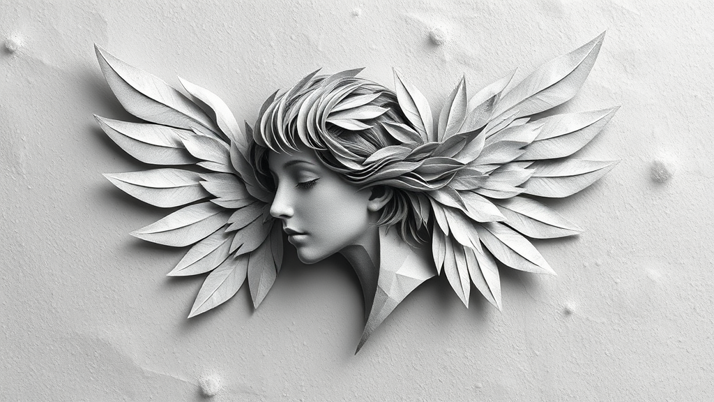 A surreal and intricate digital illustration of an angel's head with wings crafted from a paper collage in various monochrome grey shades. The background features a textured surface that enhances the composition's depth, with soft edges and subtle lighting effects adding to the dimensionality. The artwork conveys a dreamlike quality and is created using an abstract drawing technique, capturing an ethereal and otherworldly essence.