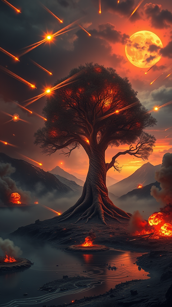 A surreal, apocalyptic war scene unfolds with a colossal tree shaped like a human kidney at its center, its branches forming intricate, glowing alveoli patterns with fiery cracks running through them. This tree, a symbol of life and vulnerability, stands tall amidst the chaos of an intense assault. Fiery comets streak across the dark, smoke-filled sky, carving trails of embers and ash. Some comets are still airborne, while others have collided with the ground, triggering massive explosions that scatter debris and flames, consuming the landscape. The once serene lake below now churns violently, sections evaporating into mist from the searing heat and nearby blasts. The terrain is ravaged with smoldering, charred hills in the backdrop, thick smoke billowing ominously, and impact craters encircling the tree. Above, the sky is a tumultuous mix of dark storm clouds, vivid fiery reds, and the faint orange remnants of a setting sun struggling to penetrate the devastation. Bright bursts from the fireballs and explosions cast dramatic shadows and bathe the battlefield in an intense, cinematic glow. This scene evokes the desperation of a climactic battle from an epic saga, presenting chaos, destruction, and the delicate symbol of life at the center of the conflict. The style is hyper-realistic and cinematic, capturing dynamic motion, vivid hues, and the detailed destruction surrounding this embattled landscape.