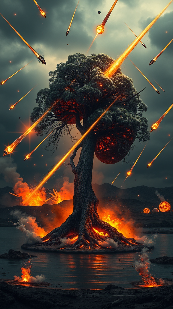 A surreal, apocalyptic war scene unfolds with a gargantuan tree shaped like a human kidney at its center, its branches resembling intricate alveoli patterns, glowing with fiery fissures. This tree embodies life and vulnerability, standing defiantly amidst relentless chaos and attack. Fiery meteors streak across the darkened, smoke-laden sky, leaving trails of glowing embers and ash. Some fireballs are in mid-flight, while others strike the ground, unleashing massive explosions that send debris, smoke, and flames cascading through the environment. The once-serene lake beneath churns violently, its surface disrupted by heat and eruptions, with tendrils of mist rising from where water evaporates. The landscape bears the scars of battle, with hills blackened and scorched in the backdrop and smoke spiraling ominously skyward. Impact craters pockmark the terrain around the tree. The sky is a turbulent canvas painted with shades of dark gray, vibrant fiery reds, and soft oranges from the remnants of a setting sun trying to pierce through the destruction. Bright flashes from the fireballs and explosions throw dramatic shadows, lighting the battlefield with an intense, cinematic glow. The scene evokes the feeling of a desperate, climactic struggle akin to a grand war epic, with chaos and destruction surrounding the fragile icon of life at the heart of the conflict. The style is hyper-realistic and cinematic, capturing dynamic movements, vivid colors, and intricate details of fire, smoke, and the devastated landscape.