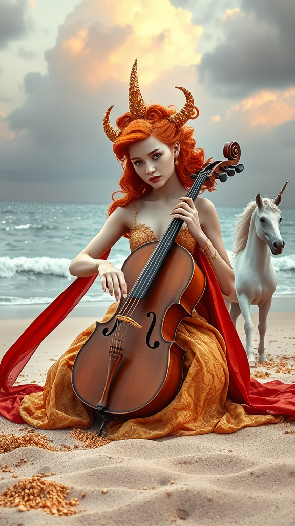 A surreal beach landscape unfolds in vivid colors and mesmerizing detail. In the foreground, a delicate female figure sits gracefully on the sandy shore, passionately playing a large, ornate cello. Her pale skin glows with an ethereal quality, and her sharp, refined facial features highlight striking eyes filled with curiosity and wonder. Her vibrant orange hair cascades in whimsical curls, styled into an enchanting horn-like shape atop her head, lavishly adorned with glittering golden embellishments. She's dressed in a rich golden gown, intricately patterned, which flows elegantly around her figure. A dramatic red cloak swirls alongside, merging seamlessly with the golden grains of sand that dance with the motion of her music. The ocean sparkles in the background, reflecting the moody sky above, filled with pastel-hued clouds, hinting at an impending change in the weather. To the right, a majestic white unicorn stands poised on the shore, gazing contemplatively towards the ocean, adding a fantastical element to the dreamlike scene. This ethereal atmosphere blends reality and imagination, with soft, rhythmic waves kissing the shoreline and the ethereal music resonating throughout the landscape. The style evokes Michael Cheval, Michael Whelan, Alex Alemany, Renoir, and Dali, filled with surrealism and vivid colors, capturing a masterpiece of photorealism. The scene is illuminated by diffuse lighting and ambient occlusion, featuring polished, masterful surrealism with ultra-real, 3D textured elements. Volumetric lighting bathes the scene in a soft glow, creating a psychedelic, immersive experience, with pencil-sharp edges, rich color, and atmospheric depth.